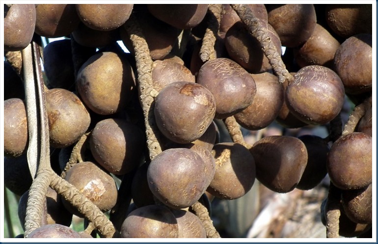 Fruits 1-seeded (Fig. 4), (4-) 5-6 cm long, 4-5 cm in wide, highly variable in shape and size (shouldered, asymmetrical, oblong-ovoid, obovoid, rarely ovoid, usually pear-shaped), borne on a 6-8 mm long pedicel, basal stigmatic remains; epicarp ranging from orange, red to brown or dark-brown in ripe fruits, smooth, shiny, waxy, often presence of small dots; reduced sterile carpels (1-2) usually visible towards the base of the fruit; mesocarp conspicuously fibrous, up to 8 mm thick, sweet; endocarp well developed. Seeds as diversely shaped as the fruits, basally attached, endosperm white, with a coconut flavour when young, with a central hollow cavity when ripe; germination remote-tubular, cotyledonary petiole buried up to 80 cm underground; eophyll linear-lanceolate, plicate.